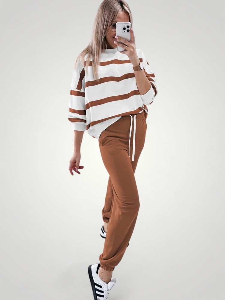 Découvrez l'ensemble décontracté à rayures EVA Brown, alliant confort et style pour vos journées. Ce pull à rayures et jogger assorti est idéal pour se détendre à la maison ou faire du shopping tout en restant chic. Avec son design intemporel et son ajustement décontracté, cet ensemble vous permet de rester élégant en toute simplicité.